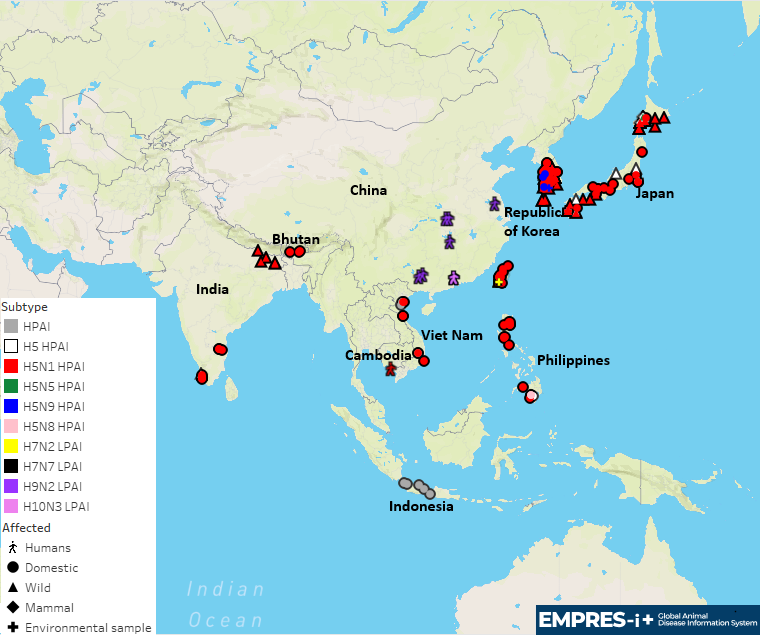 During the period from 10 December 2025 to 2 March 2026, at least four high pathogenicity avian influenza (HPAI) virus subtypes (H5N1, H5N5, H5N8 and H5N9) and four low pathogenicity avian influenza (LPAI) virus subtypes (H7N2, H7N7, H9N2 and H10N3) have been reported in East, South, and Southeast Asia. H5Nx HPAI viruses continue to circulate in Asia and are well established in certain areas of the region.
