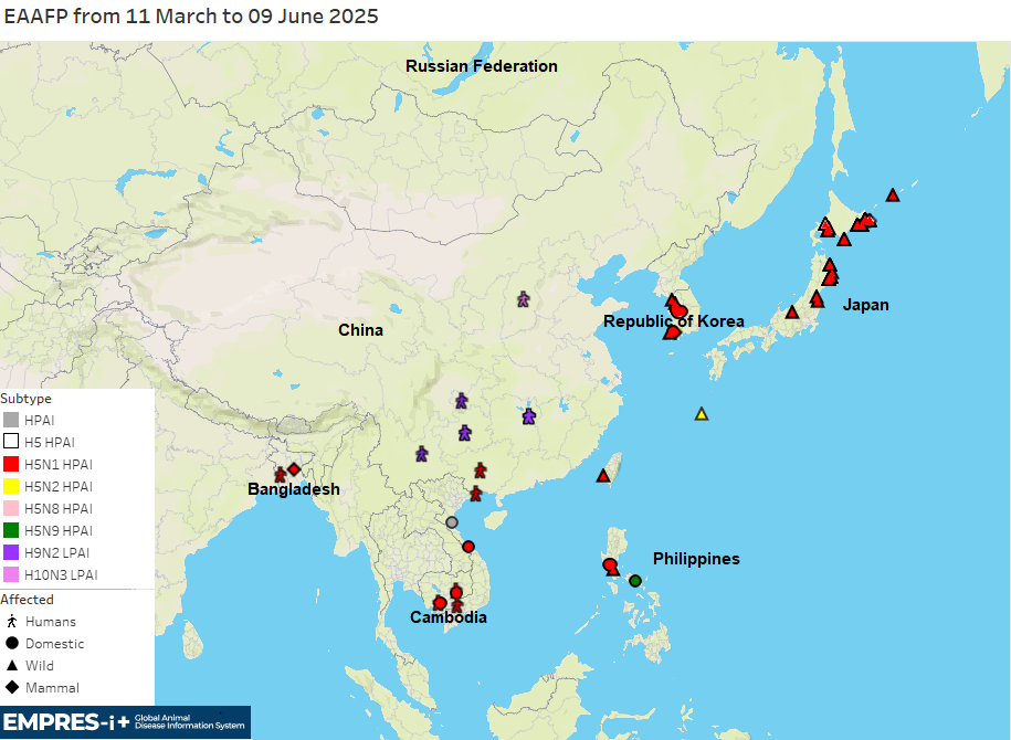 During the period from 11 March to 9 June 2025, at least three high pathogenicity avian influenza (HPAI) virus subtypes (H5N1, H5N2, H5N9) and two low pathogenicity avian influenza (LPAI) virus subtypes (H9N2, H10N3) have been reported in East and Southeast Asia. H5Nx HPAI viruses continue to circulate in Asia and are well established in certain areas of the region.