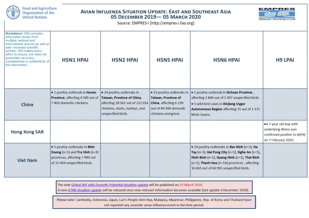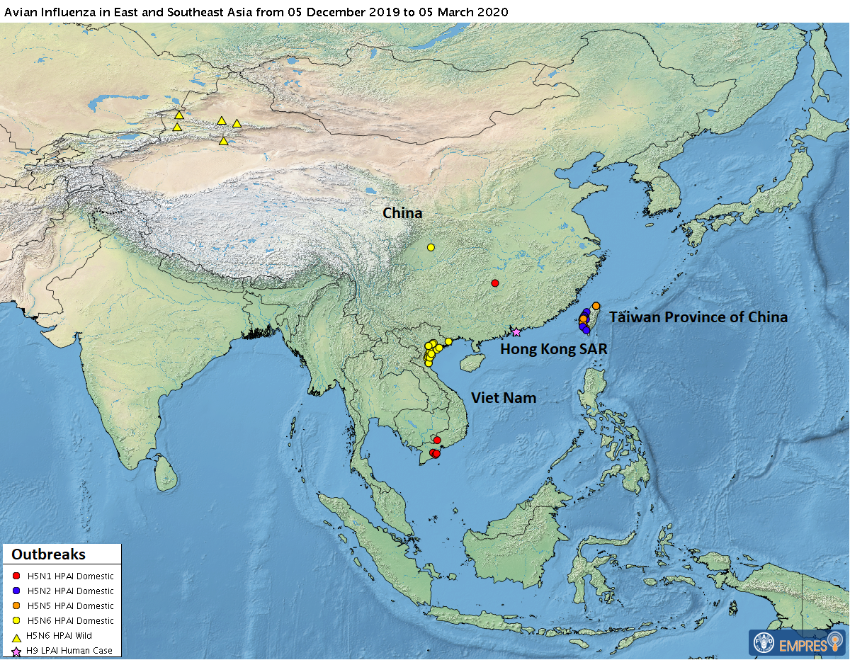 During the period 5 December 2019 to 5 March 2020, five different avian influenza virus subtypes have been reported in East and South-East Asia, four of them highly pathogenic in poultry (H5N1, H5N2, H5N5 and H5N6 HPAI) and one low pathogenic in poultry (H9 LPAI). In China, one outbreak of H5N1 HPAI was confirmed in chickens in Hunan Province. The last report of H5N1 HPAI had been recorded on 31 March 2019. In addition, H5N6 HPAI caused one poultry outbreak in Sichuan Province, China and five wild bird cases (Mute swans) in Xinjiang Uygur Autonomous Region, near the border with the Republic of Kazakhstan. Viet Nam reported five H5N1 HPAI outbreaks and 29 H5N6 HPAI outbreaks affecting domestic birds of unspecified species. In Taiwan, Province of China, 24 outbreaks in poultry were confirmed to be caused by H5N2 HPAI affecting a range of domestic bird species including chickens, ducks, turkeys and other unspecified bird species. H5N5 HPAI caused 15 additional outbreaks in domestic chickens and geese in Taiwan, Province of China. This H5N5 HPAI virus is phylogenetically close to viruses circulating in Europe in 2016-2017.