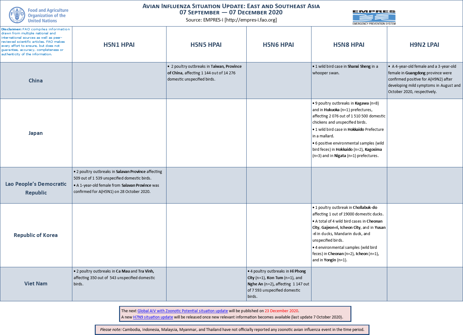 During the period 7 September to 7 December 2020, four highly pathogenic avian influenza (HPAI) virus subtypes and H9N2 low pathogenic avian influenza (LPAI) have been reported in East and South-East Asia. Two H5N1 HPAI outbreaks were reported in smallholder farms in Ca Mau and Tra Vinh provinces in Viet Nam, affecting a total of 350 out 543 unspecified domestic birds. Lao People’s Democratic Republic also reported two H5N1 HPAI outbreaks in Saravan Province, affecting 509 out of 1 539 unspecified domestic birds. In addition, H5N6 HPAI caused four poultry outbreaks in Northern and Central Viet Nam, affecting a total of 1 147 unspecified domestic birds. In Taiwan, Province of China, H5N5 HPAI virus continues to circulate endemically and caused two poultry outbreaks affecting 1 144 out of 14 276 unspecified domestic birds.