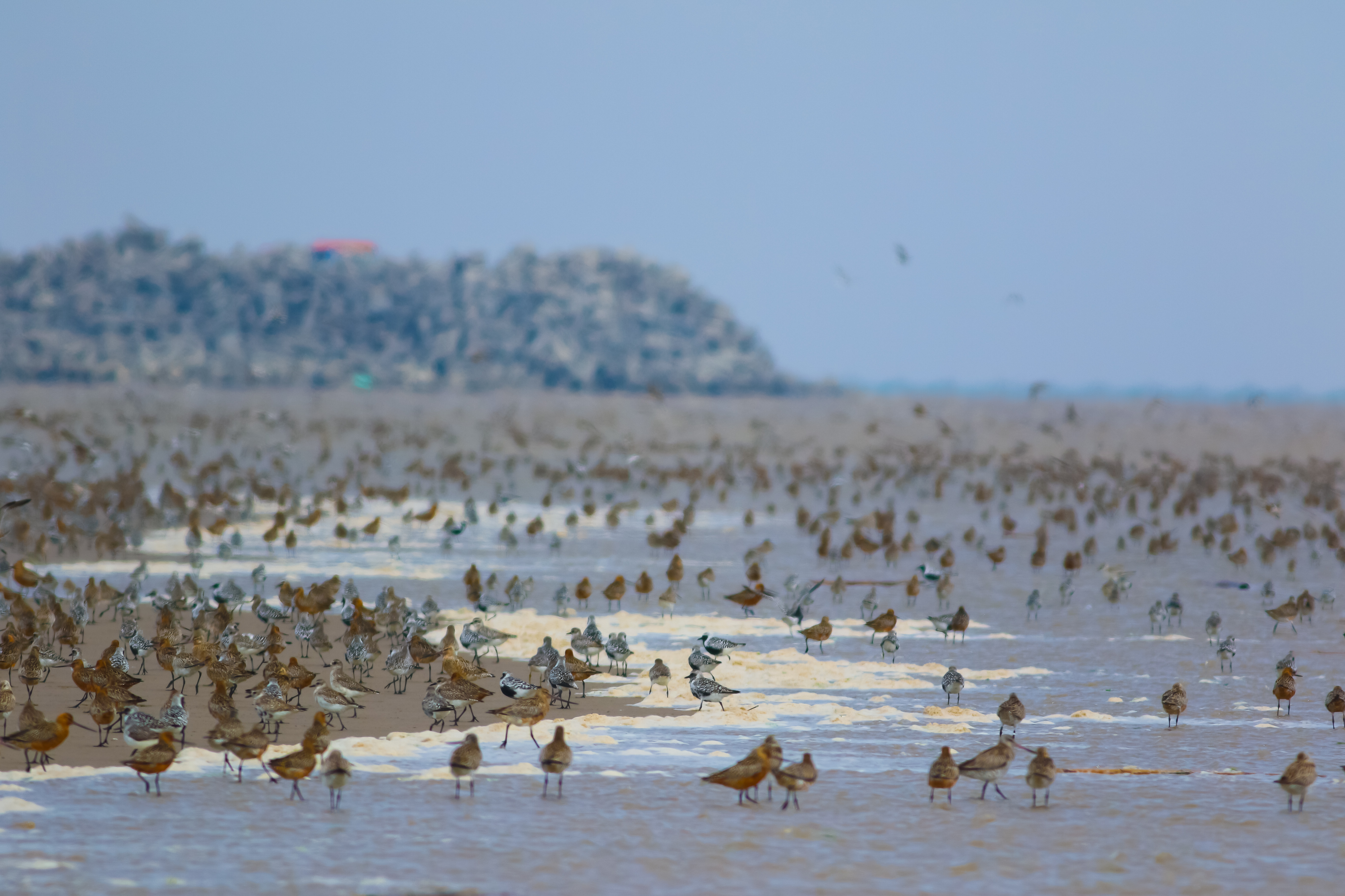 Shorebirds congregating on the upper tidal flats at Tiaozini in Jiangsu Province, China. Erosion of the tidal flats after the completion of seawall in year 2013 might have greatly changed the landscape and the distribution of foraging shorebirds, a major but poorly understood change that may severely affect shorebird populations using this newly inscribed World Heritage Site © Tong Mu