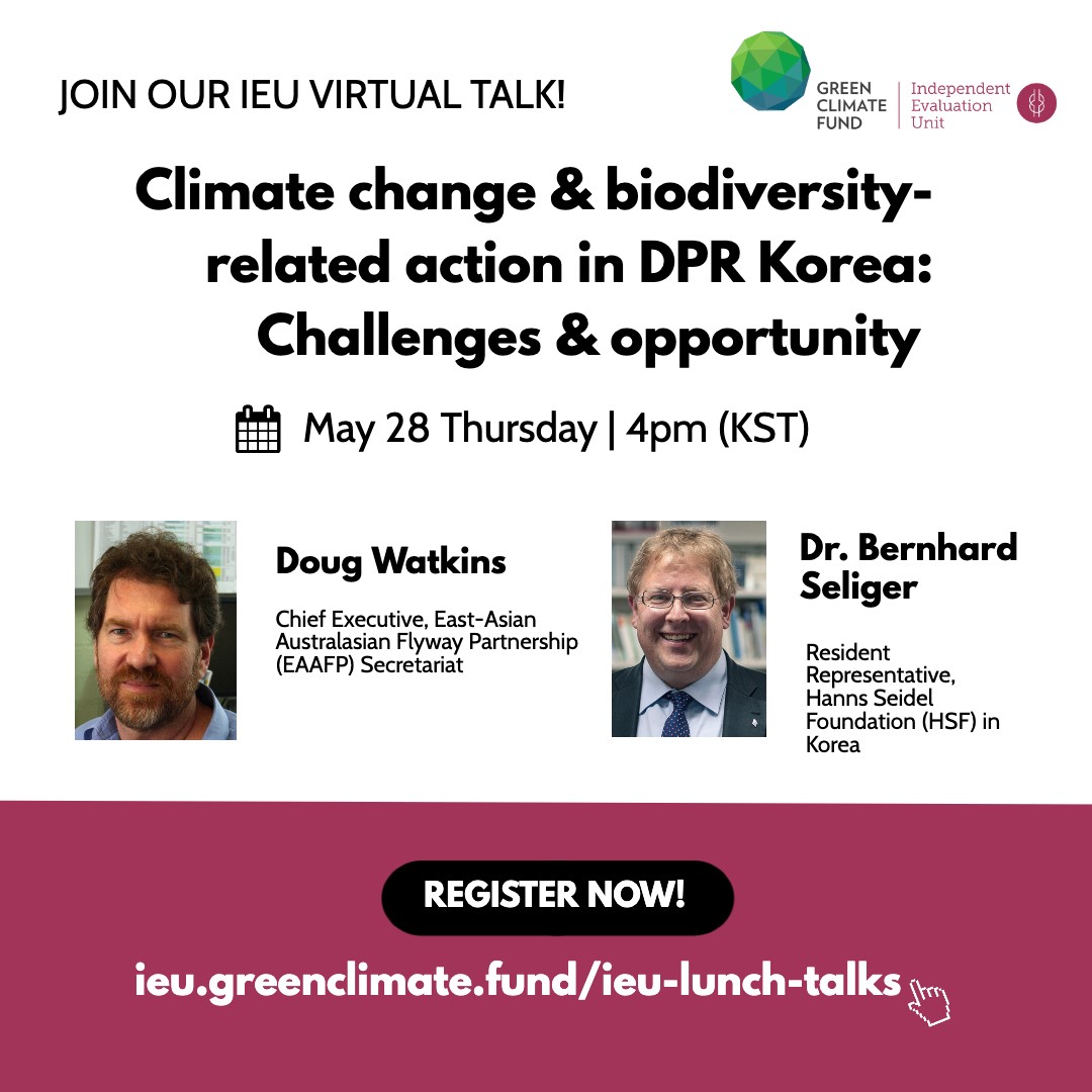 On 28 May 2020 at 16:00 (KST), Mr. Doug Watkins, Chief Executive of EAAFP, together with Dr Bernhard Seliger, the Resident Representative of Hanns Seidel Foundation (HSF) in Korea (EAAFP Partner) were invited to present on the Virtual Talk organized by Green Climate Foundation (GCF) Independent Evaluation Unit (IEU). The topic was “Climate Change & Biodiversity-related Action in DPR Korea: Challenges & Opportunity”. Due to the COVID-19 situation, the original Lunch Talk was changed to the on-line version, which allowed more audience to join. There were over 100 people attended the talk.
