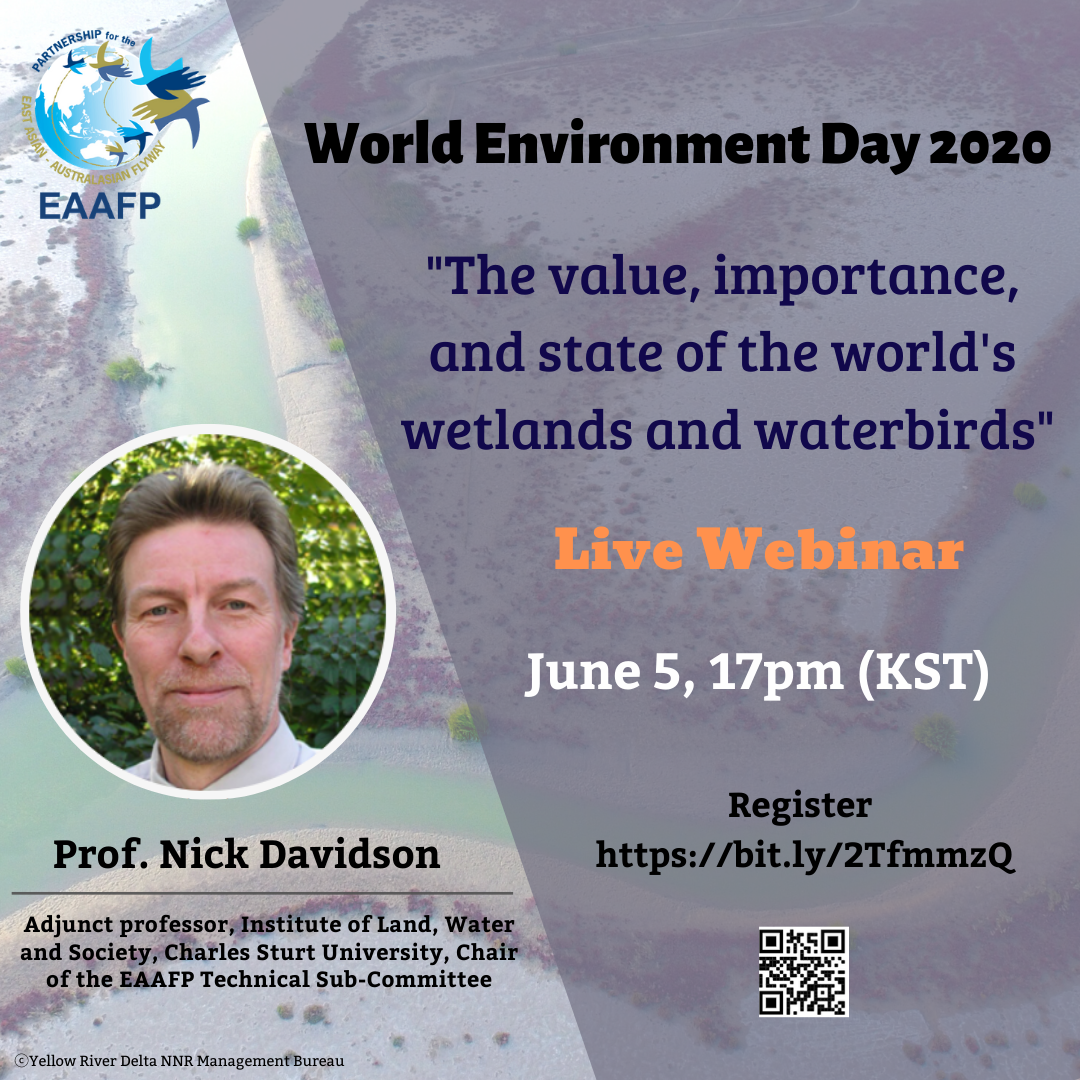 On 5 June 2020 at 5pm (KST), EAAFP Secretariat organized the third webinar, in line with the World Environment Day. The Webinar was titled as “The value, importance, and state of the world’s wetlands and wetlands”, given by honorable guest speaker, Prof. Nick Davidson. Prof. Nick Davidson is the Chair of EAAFP Technical Sub-Committee and an adjunct professor in the Institute of Land, Water and Society of Charles Sturt University. As the Deputy Secretary General of the Ramsar Convention on Wetlands from 2000 to 2014, he cordially dedicated himself to global development and delivery of scientific, technical advice and policy guidance and played a senior advisor role in the Secretariat of the Ramsar Convention. He has a deep understanding on, and a strong commitment to environmental sustainability, with the support through the transfer of environmental science into policy-relevance and decision-making at national and international level.