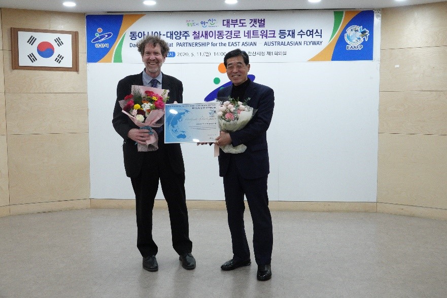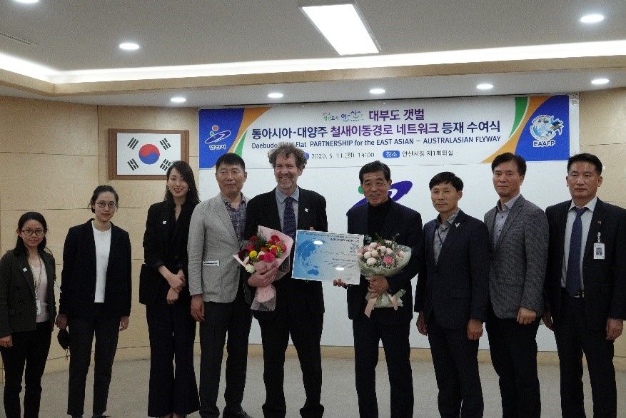On May 11 2020, a ceremony was held for the new Flyway Network Site (FNS) Daebudo Tidal Flat (EAAF 148) in the Republic of Korea, which was officially included in the EAAFP Flyway Site Network on May 9 2020, in celebration of the World Migratory Bird Day. Chief Executive, Mr. Doug Watkins and staff members of the EAAFP Secretariat met with Ansan City government officials, including the Ansan Mayor, Mr. Yoon Wha-Sub, site managers as well as the Ansan Evergeen Foundation CEO, Mr. Jeon Junh.