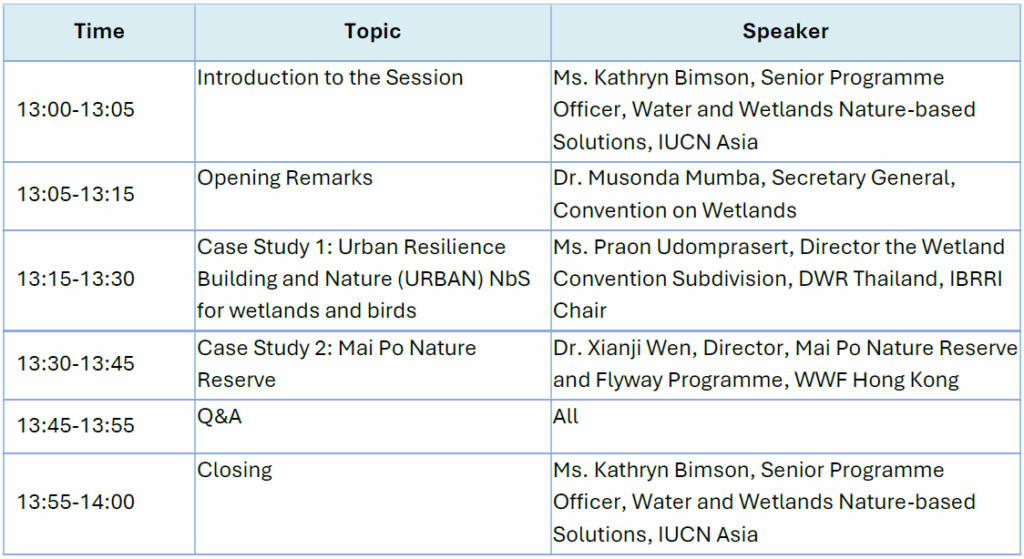 This side event will introduce Nature-based Solutions and their potential applications in wetlands, highlighting examples from the EAAF. Case studies will demonstrate how Nature-based approaches provide benefits to both local communities and biodiversity, acting as a win-win solution, which is often more cost effective than traditional grey infrastructure approaches.