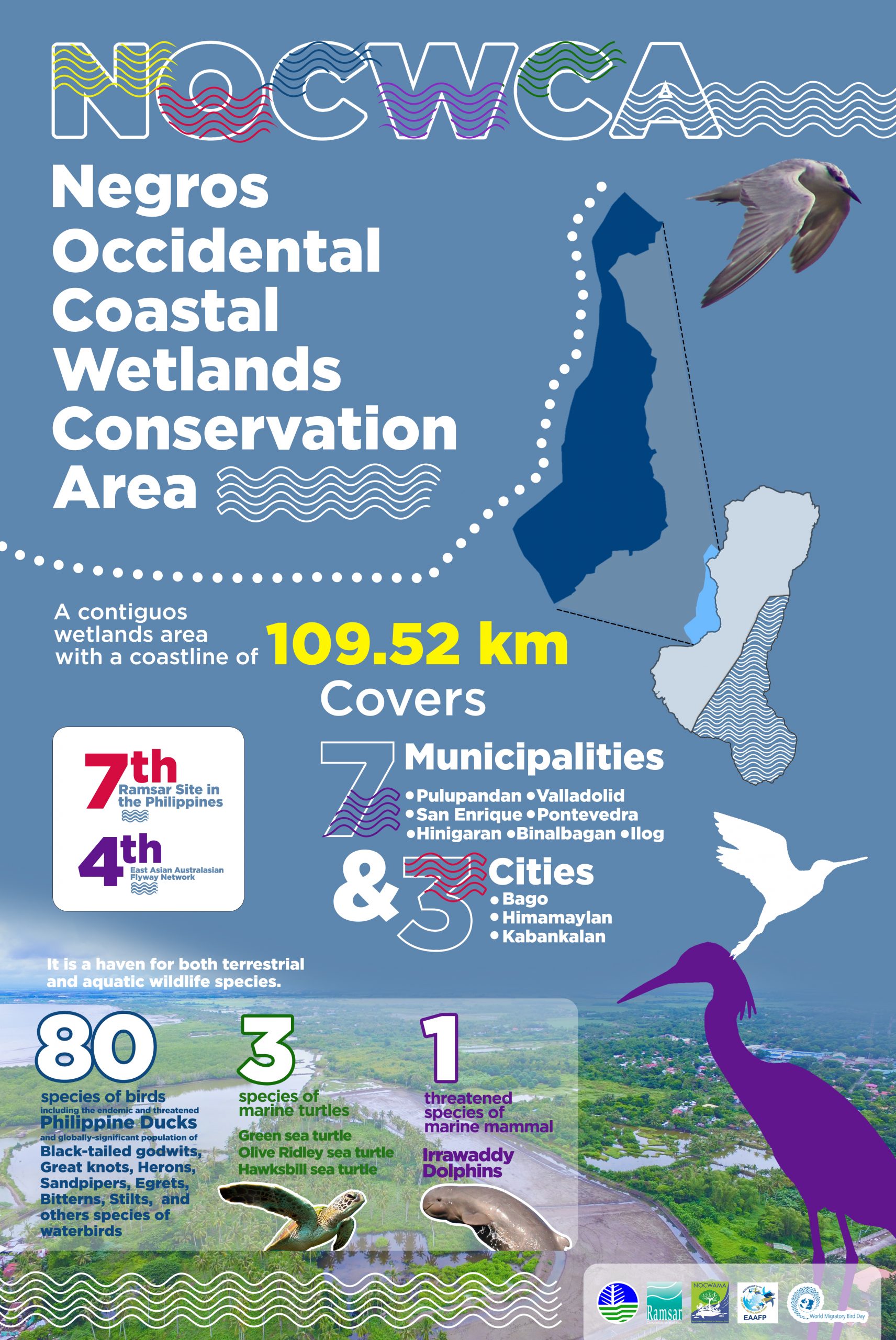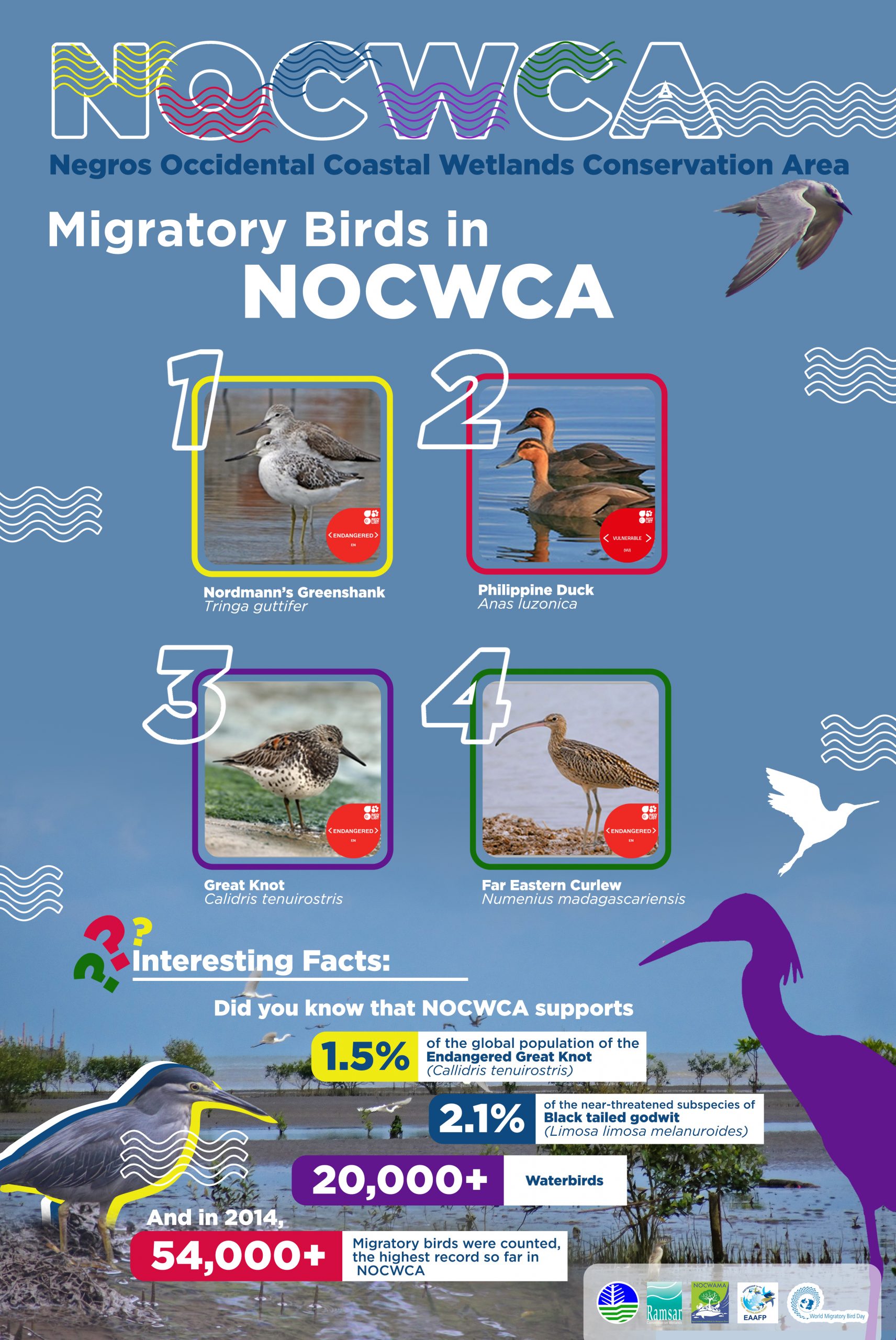 In celebration of this year’s World Migratory Bird, the Provincial Environment and Natural Resources of Negros Occidental highlighted the importance of the Negros Occidental Coastal Wetlands Conservation Area (NOCWCA) as the declared 7th Ramsar Site and 4th East Asian Australasian Flyway Network Site in the Philippines. The NOCWCA is a contiguous wetlands area with a coastline of 109.52 kilometers which covers seven (7) Municipalities (Pulupandan, Valladolid, San Enrique, Pontevedra, Hinigaran, Binalbagan, Ilog) and three (3) Cities (Bago, Himamaylan, Kabankalan). It is a haven for both terrestrial and aquatic wildlife species that includes 1 threatened species of Marine Mammals, the Irrawaddy Dolphins, three (3) species of marine turtles, the Green Sea Turtle, the Olive Ridley Sea Turtle and Hawksbill Sea Turtle. At least 80 species of birds including the endemic and threatened Philippine Ducks and globally-significant population of Black-Tailed Godwits, Great Knots, Herons, Sandpipers, Egrets, Bitterns, Stilts and other species of waterbirds are also present in the area. NOCWCA also supports 1.5% of the global population of the Endangered Great Knots and 2.1% of the near-threatened subspecies of Black-Tailed Godwit. NOCWCA serves as a habitat for more than 20,000 waterbirds at a time, making it a crucial site for bird conservation.