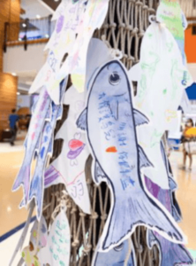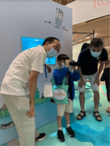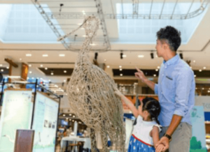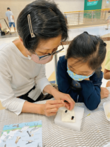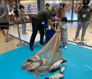 Besides, binoculars were provided to visitors to experience “bird watching”. A panel with ringed birds were displayed. Some of the birds also carried message of WMBD2022 – “Dim the lights for birds at night!”. Hence, when participants tried the binoculars, they could read the message. Our onsite volunteers introduced more WMBD and migratory birds to participants too. Also, in weekends, kids could learn net-casting like fishermen and learn the pond fish farming culture in fishpond. Our mascot, Mullet-kun, showed up and greeted visitors at the exhibition during weekends.