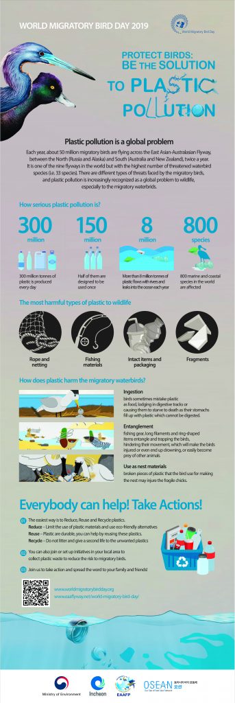 The Small Grant for 2019 World Migratory Bird Day (WMBD) has been established to provide financial support to EAAFP Partners and collaborators from EAAFP Task Forces and Working Groups who plan to organize public events and/or conservation action-oriented workshops at national or local levels through participating in the World Migratory Bird Day. We strongly encourage EAAFP Partners and collaborators to make an application for any suitable event or development of WMBD materials in local language that aims to raise awareness on the need of conserving migratory waterbirds and the value of their habitats in East Asian – Australasian Flyway.