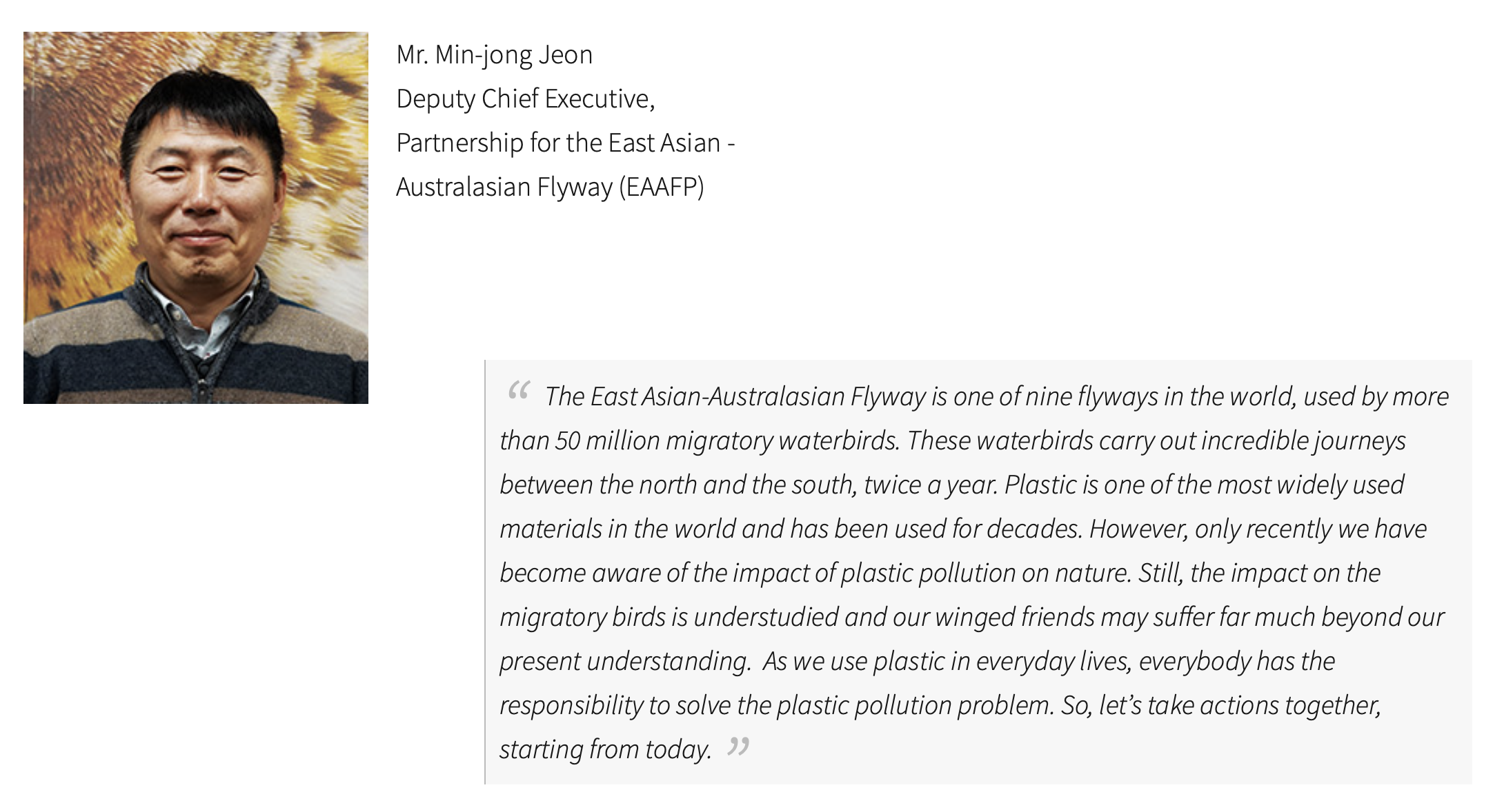 UN Environment Department stated plastic pollution is a key environmental issue at the global level and a major threat to marine and coastal biodiversity. About 800 marine and coastal species areaffected by the plastic debris. On the other hand, there is a lack of systematic studies of the impact of plastic on wildlife, let alone how much we understand the impact on migratory birds, especially in Asia. This is an opportunity for different stakeholders including the government, non-government organizations and private sector to discuss possible and practical solutions to plastic pollution in the World. And to take actions with different sectors, including the general public, to tackle this global problem.