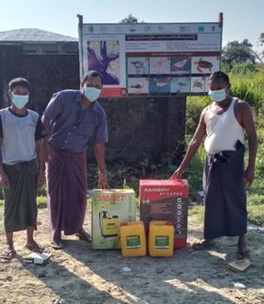 On 8th -9th October 2021, RBANCA team members and local forest department staff are installed four signboards (Height 3 ‘ x Length 6’) about Spoon-billed Sandpiper and other globally threatened species which are fully protection under the Conservation of Biodiversity and Protected Areas Law (2018) Myanmar. One signboard was installed at the Island and another three signboards at Angu Maw, Man Kyi Chaung and Kone Dan villages nearby Ramsar Site). On the event days, the team members distributed (Height 3’ x Length 2’) Spoon-billed Sandpiper information leaflets to villagers and tagged the posters at the grocery shops, markets and tea shops where many people visit. Moreover, the team handover five manual disinfected spray pumps for protection of the COVID-19 virus disease in the villages. When distributing the posters to villagers, the team members explained about the World Migratory Bird Day event and why it is important to conserve migratory waterbirds.