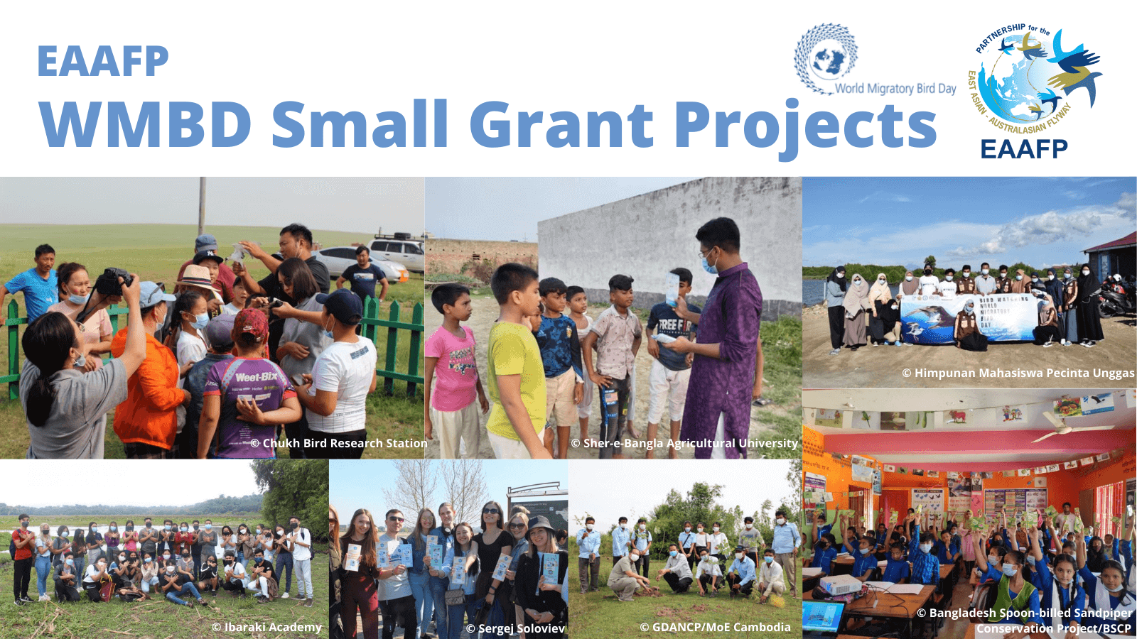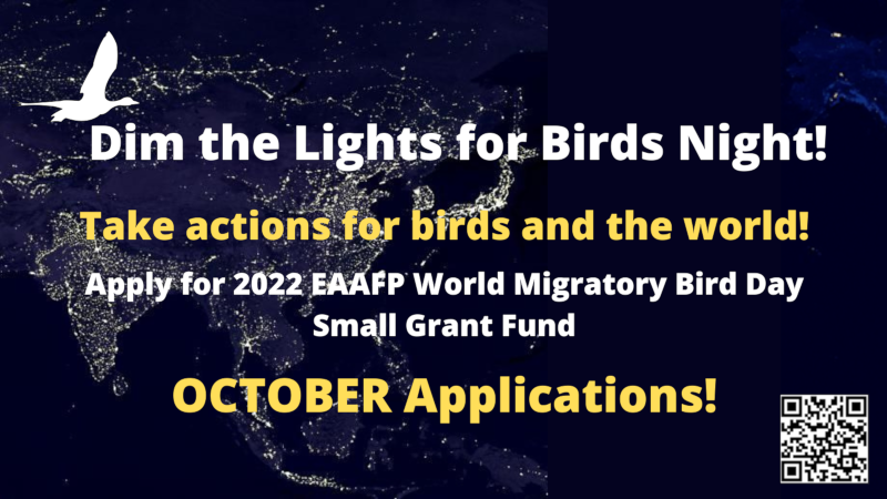 The Small Grant for 2022 World Migratory Bird Day (WMBD) has been established to provide financial support for EAAFP Partners and collaborators from EAAFP Task Forces and Working Groups, who plan on organizing public events and/or conservation action-oriented workshops at national or local levels for World Migratory Bird Day. We strongly encourage EAAFP Partners and collaborators to make an application for any suitable event or development of WMBD materials in local languages, that aim to raise awareness on the need of conserving migratory waterbirds and the value of their habitats in the East Asian – Australasian Flyway.