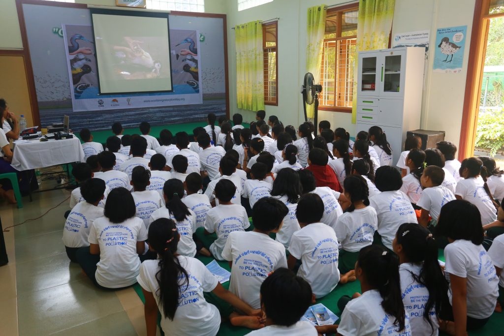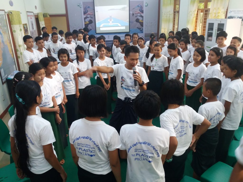 BANCA celebrated World Migratory Bird Day 2019 at Environmental Education Centre (EESC), where is located in Theinngu village, Belin Township, Mon State (Gulf of Mottama, EAAFP Flyway Netowrk Site EAAF117) on May 11, 2019 with the Title of World Migratory Bird Day Event. There were (131) participants attended involving both middle and high students and their teachers, Government Staff members, Local Conservation Groups (LCG) and village headers and distributed WMBD Flyer and pamphlets on plastic pollution that impact on migratory bird species and their habitats as well as other wildlife, East-Asian Flyway Network and migratory bird species of Spoon-billed Sandpiper in Gulf of Mottama (GoM). That event was commenced with the awareness talk on environmental conservation including habitats of Spoon-billed Sandpiper in Gulf of Mottama which is the largest wintering site of SBS in there, plastic pollution related with 2019 theme of WMBD, and migratory birds as well. After the presentations, video presentations with the purpose of being more knowledgeable for participants mainly for students and then question and answer session by the participants. The game activities for students also involved in that event such as Spoon-billed counting game, the importance of wetlands game which is from a reference from Spoon-billed Sandpiper Teaching Kit Book, matching game for migratory bird species. All students enjoyed playing these games very much and we awarded prizes for winners after competitions. When we finished all activities, plastic clean up activity near costal area of Koe Te Su Village of Gulf of Mottama was carried out by all participants.