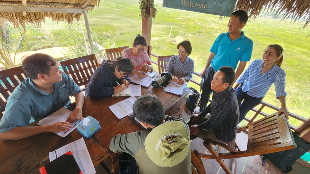 The group then headed to the field at Anlung Pring Protected Landscape, a designated Flyway Network Site of the East Asian-Australasian Flyway Partnership (EAAFP), where they engaged in hands-on exercises in Ecosystem Services Assessment, Climate Change Vulnerability Assessment, and Visitor Experience Assessment. These exercises allowed participants to apply their classroom knowledge in the field, gaining firsthand experience in evaluating and managing wetland areas. A recurring theme throughout the course was the conservation of the sarus crane, a waterbird of global conservation concern, and listed as Vulnerable on IUCN’s Red List. This species was used as a focal point to discuss various conservation measures, vulnerability to climate change and the role of community-based ecotourism (CBET) efforts, among other topics.