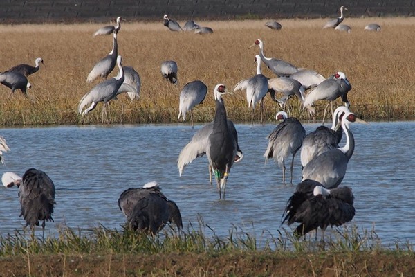 The majestic White-naped Crane is an iconic species of the threatened wetlands and grasslands of East Asia. Populations use two different flyways, linking breeding areas to stopover and wintering grounds. The Western population, many of which nest in Mongolia, southern Russia and northern China, migrate to wintering areas around Poyang Lake in Southeast China. This population has declined by up to two-thirds, numbering at most 1,500 birds. The Eastern population, nesting mainly in Russia, migrates to the Demilitarized Zone – DMZ area of Korea and down to Izumi in southern Japan. This population is stable at about 7,500 individuals.