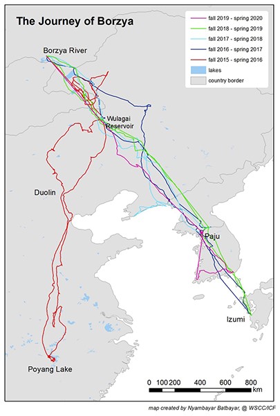 Borzya’s fall and spring migrations are illustrated by different colors on this map. The first year, she migrated from Mongolia south to Poyang Lake in China for the winter, shown in red. All subsequent years, she has migrated to South Korea and Japan in the fall.