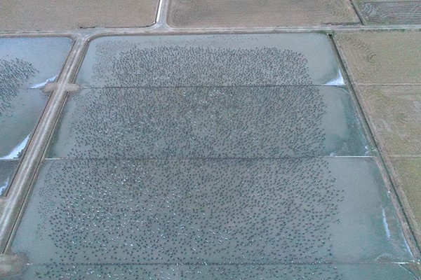 An aerial view of the Crane roost at Arasaki, Izumi in Japan, where over 17,000 Hooded and White-naped Cranes winter.