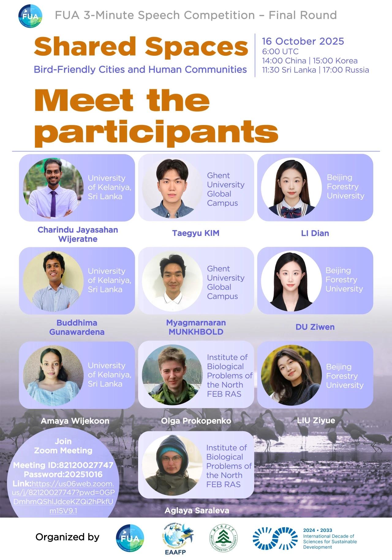 Liu Ziyue from Beijing Forestry University (BFU) was awarded Grand Champion during the finals of the FUA held online on 16 October 2025. Liu was invited to speak at the MOP12 plenary. Her winning speech, Saving the Songs: Creating Bird-Friendly Cities in a Rapidly Urbanizing World, shares that bird-friendly cities save 1 Billion lives as 1 billion birds die due to window collisions.